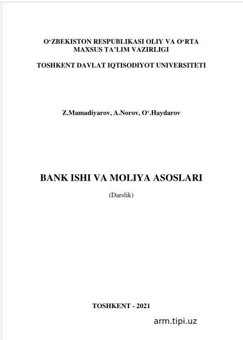 Z.Mamadiyarov, A.Norov, O‘.Haydarov_Bank ishi va moliya asoslari. Darslik –T. Innovatsion rivojlanish nashriyot-matbaa uyi, 2021 – 240 b. 26/11/2025 22:51 Iqtisodiyot fakulteti o‘quv adabiyotlari (bakalavr 0 1 2 3 4 5 kutubxona 0 23