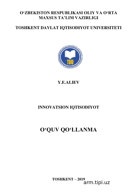 Y.E.Aliev. Innovatsion iqtisodiyot. O‘quv qo‘llanma. - Toshkent Iqtisodiyot, 2019 yil, 236 bet. 27/11/2025 09:17 Iqtisodiyot fakulteti o‘quv adabiyotlari (bakalavr 0 1 2 3 4 5 kutubxona 0 23