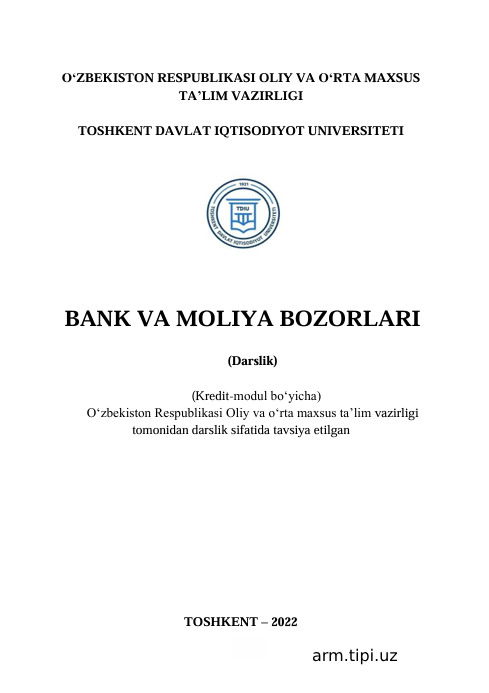 I.Toymuxamedov, U.Elbusinova, N.Sattorova. Darslik. Bank va moliya bozorlari. -T.Innovatsion rivojlanish nashriyot-matbaa uyi 2022, 272 b. 26/11/2025 09:32 Iqtisodiyot fakulteti o‘quv adabiyotlari (bakalavr 0 1 2 3 4 5 kutubxona 0 18
