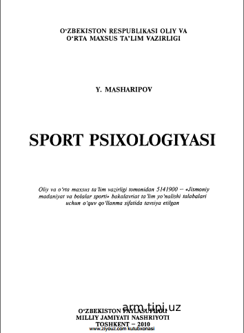SPORT PSIXOLOGIYASI Nomlanishi Yozilgan yili: 2010 - yil . Bo'limi: Sport faoliyati (Bakalavr) uchun oʻquv adabiyotlar Elektron resurs QR code surati: Resurs haqida [attachment=1220] O'xshash resurslar YOSH DAVRLARI PSIXOLOGIYASI YOSH DAVRLARI PSIXOLOGIYASI 3.5 YOSH DAVRLARI PSIXOLOGIYASI SPORT OʻYINLARI VA UNI OʻQITISH METODIKASI Sport va milliy o`yinlar (futbol)