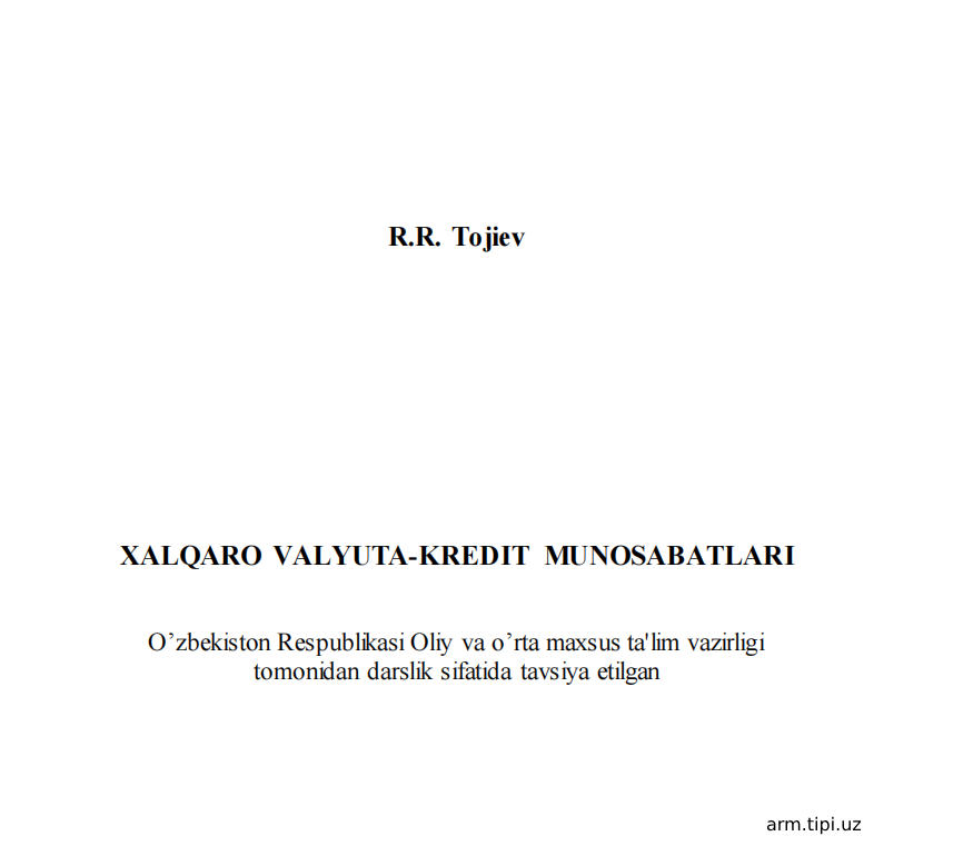 XALQARO VALYUTA-KREDIT MUNOSABATLARI 12/12/2025 15:33 Посмотреть файл онлайн: 130.pdf 130.pdf [2.02 Mb] (cкачиваний: 0) Iqtisodiyot fakulteti o‘quv adabiyotlari (bakalavr 0 1 2 3 4 5 kutubxona 0 1