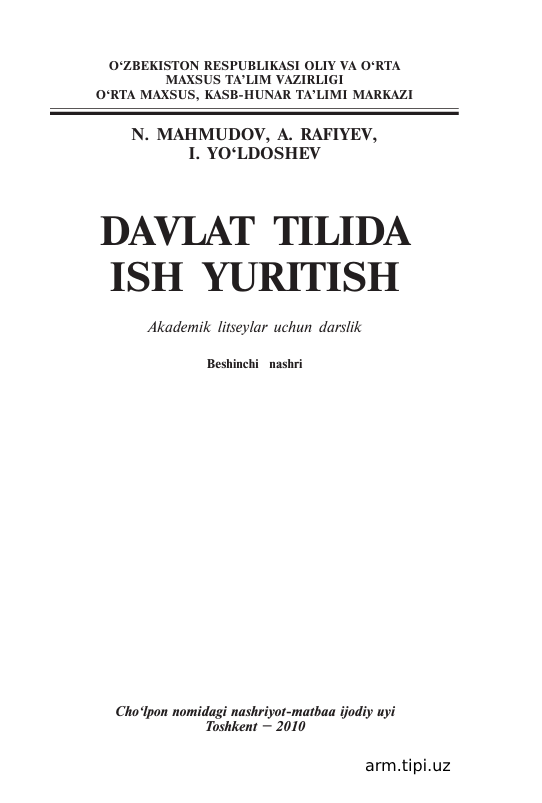 davlat tilida ish yuritish Nomlanishi Yozilgan yili: 2010 - yil . Bo'limi: Oʻzbek tili va adabiyoti (Bakalavr) uchun oʻquv ad Elektron resurs QR code surati: Resurs haqida [attachment=680] O'xshash resurslar Davlat tilida ish yuritish B.E.Mamaraximov, M.K.Abdullayeva, Ijtimoiy iqtisodiyot va davlat siyosati O'zbekiston tarixi Davlat va jamiyat taraqqiyoti Ijtimoyi iqtisodiyot va davlat siyosati XULQ-ATVORIQTISODIYOTI VA DAVLAT SIYOSATI