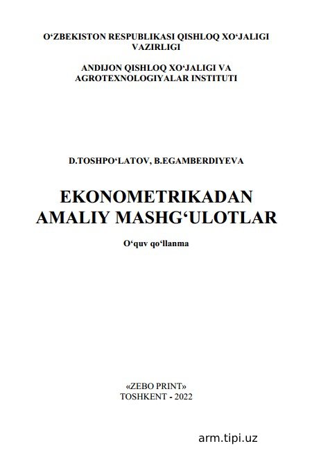 EKONOMETRIKADAN AMALIY MASHG‘ULOTLAR 27/10/2025 10:42 Посмотреть файл онлайн: 5toshp1.pdf 5toshp1.pdf [3.29 Mb] (cкачиваний: 34) Iqtisodiyot fakulteti o‘quv adabiyotlari (bakalavr 0 1 2 3 4 5 kutubxona 0 40