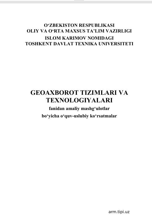 GEOAXBOROTTIZIMLARIVA TEXNOLOGIYALARI Nomlanishi Yozilgan yili: 2020 - yil . Bo'limi: Kompyuter injiniringi (Bakalavr) uchun oʻquv adabi Elektron resurs QR code surati: Resurs haqida Ko'chirib olish 2024-12-13-10-57-29_65c04640acb19fa7c09abe85576560db.pdf Hajmi: 12.48 Mb Ko'chirib olganlar: 10 Fayl nomi: 2024-12-13-10-57-29_65c04640acb19fa7c09abe85576560db.pdf Faylni online o'qish: 2024-12-13-10-57-29_65c04640acb19fa7c09abe85576560db.pdf O'xshash resurslar Tarmoq texnologiyalari MAKTABGACHA TA‘LIMDA STEAM TEXNOLOGIYALARI Geoaxborot tizimlari va texnologiyalari SPORTDA MATEMATIK STATISTIK TAHLIL O'zbek Folklori