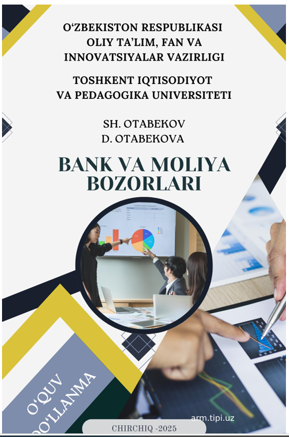 BANK VA MOLIYA BOZORLARI 28/10/2025 09:40 Посмотреть файл онлайн: oquv-qollanma_bank-va-moliya-bozorlari_sh_x_otabekov.pdf oquv-qollanma_bank-va-moliya-bozorlari_sh_x_otabekov.pdf [4.39 Mb] (cкачиваний: 27) Iqtisodiyot fakulteti o‘quv adabiyotlari (bakalavr 0 1 2 3 4 5 kutubxona 0 47