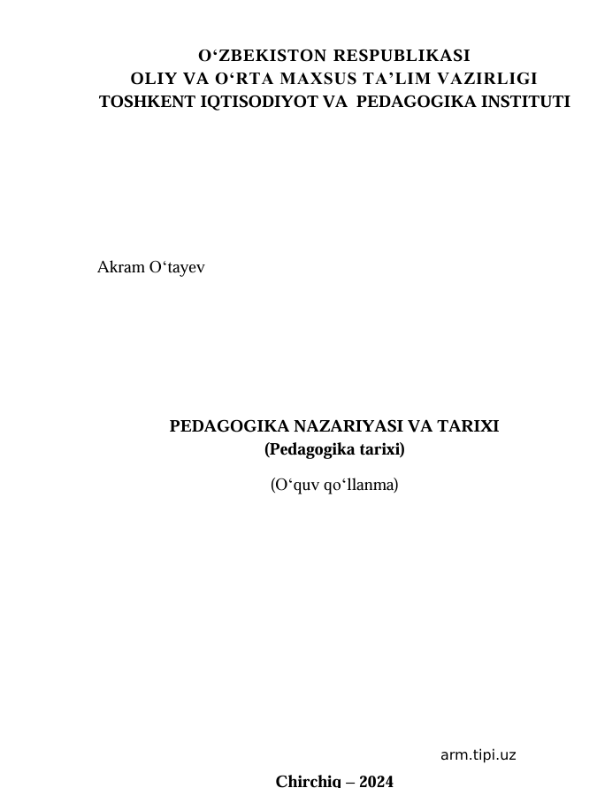PEDAGOGIKA NAZARIYASI VA TARIXI Nomlanishi Yozilgan yili: 2024 - yil . Bo'limi: Pedagogika (Bakalavr) uchun oʻquv adabiyotlari Elektron resurs QR code surati: Resurs haqida Ko'chirib olish otayev_a_oquv_qollanma_oxirgi_variant_pedagogika_tarihi_.pdf Hajmi: 1.73 Mb Ko'chirib olganlar: 66 Fayl nomi: otayev_a_oquv_qollanma_oxirgi_variant_pedagogika_tarihi_.pdf Faylni online o'qish: otayev_a_oquv_qollanma_oxirgi_variant_pedagogika_tarihi_.pdf O'xshash resurslar Axmedov A.A Ijtimoiy pedagogika Kamolot nashryoti Buxoro 2023 Egamberdiyeva N. Ijtimoiy pedagogika O'zbekiston tarixi I jild B.I.Isroilov, R.O . Xolbekov Buxgalteriya hisobi nazariyasi Buxgalteriya hisobi nazariyasi Bahodir Isroilov Rasul Xolbekov