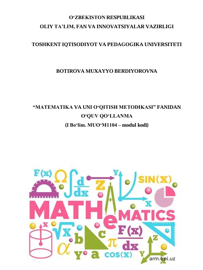 “MATEMATIKA VA UNI O‘QITISH METODIKASI” Nomlanishi Yozilgan yili: 2025 - yil . Bo'limi: Pedagogika (Bakalavr) uchun oʻquv adabiyotlari Elektron resurs QR code surati: Resurs haqida Ko'chirib olish botirova-m_oquv-qollanma_2025-botirova.pdf Hajmi: 3.18 Mb Ko'chirib olganlar: 13 Fayl nomi: botirova-m_oquv-qollanma_2025-botirova.pdf Faylni online o'qish: botirova-m_oquv-qollanma_2025-botirova.pdf O'xshash resurslar Boshlang'ich sinflarda matematika o'qitish metodikasi labaratorya Boshlang`ich sinflarda matematikao'qitish metodikasi 2005 TARIX O'QITISH METODIKASI Biznes matematika D. SALIMOV Oliy Matematika 2-jild