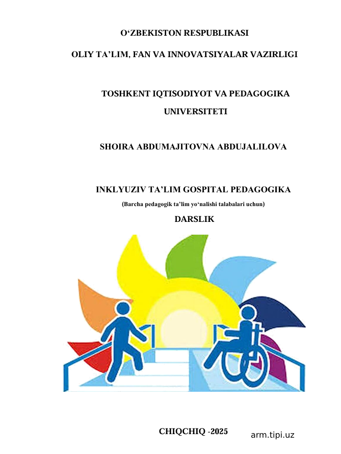 INKLYUZIV TA’LIM GОSPITAL PЕDAGОGIKA Nomlanishi Yozilgan yili: 2025 - yil . Bo'limi: Pedagogika (Bakalavr) uchun oʻquv adabiyotlari Elektron resurs QR code surati: Resurs haqida Ko'chirib olish abdujalilova-sh_darslik-2025-oxirgi-variant.pdf Hajmi: 2.51 Mb Ko'chirib olganlar: 13 Fayl nomi: abdujalilova-sh_darslik-2025-oxirgi-variant.pdf Faylni online o'qish: abdujalilova-sh_darslik-2025-oxirgi-variant.pdf O'xshash resurslar B.Y.Xodiyev, Sh.Sh.Shodmonov. Iqtisodiyot nazariyasi Inklyuziv talim nazariya va metodika Maxsus va inklyuziv ta'lim konferensiya materiallari MAXSUS VA INKLYUZIV TA'LIM MAKTABGACHA TA’LIM MUAS SASALARIDA MUSIQA 0‘QITISH METODIKASI