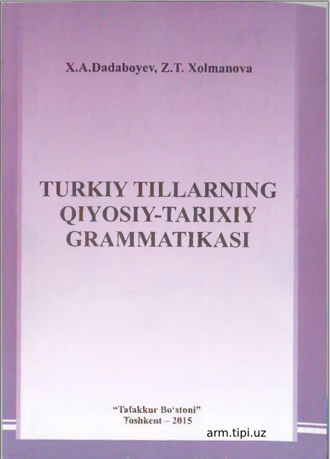 Turkiy tillarning qiyosiy-tarixiy grammatikasi. Nomlanishi Yozilgan yili: 2015 - yil . Bo'limi: Oʻzbek tili va adabiyoti (Bakalavr) uchun oʻquv ad Elektron resurs QR code surati: Resurs haqida O'xshash resurslar Qadimgi turkiy til O`rta osiyo Numizmatikasi Yordamchi tarixiy fanlar TARIXIY O‘LKASHUNOSLIK VA TURIZM USLUBIY QO‘LLANMA TARIXIY O‘LKASHUNOSLIK VA TURIZM USLUBIY QO‘LLANMA