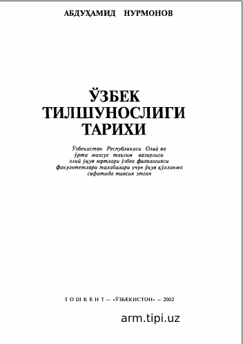 O`zbek tilshunosligi tarixi Nomlanishi Yozilgan yili: 2002 - yil . Bo'limi: Oʻzbek tili va adabiyoti (Bakalavr) uchun oʻquv ad Elektron resurs QR code surati: Resurs haqida O'xshash resurslar O`zbek davlatchiligi tarixi O'zbekiston tarixi I jild O'ZBEKISTON TARIXI IX O'zbekiston tarixi VI jild O'zbekiston tarixi VI jild