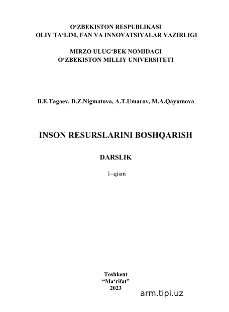 B.E. Tagaev, D.Z.Nigmatova, A.T. Umarov, M.A. Qayumova. Inson resurslarini boshqarish. Darslik. T.Ma’rifat, 2023, 246 bet. 27/11/2025 09:47 Посмотреть файл онлайн: 2_-b_e_-tagaev-d_z_nigmatova-a_t_-umarov-m_a_-qayumova_-inson-resurslarini-boshqarish_-darslik_-t_marifat-2023-246-bet.pdf 2_-b_e_-tagaev-d_z_nigmatova-a_t_-umarov-m_a_-qayumova_-inson-resurslarini-boshqarish_-darslik_-t_marifat-2023-246-bet.pdf [5.46 Mb] (cкачиваний: 10) Iqtisodiyot fakulteti o‘quv adabiyotlari (bakalavr 0 1 2 3 4 5 kutubxona 0 13