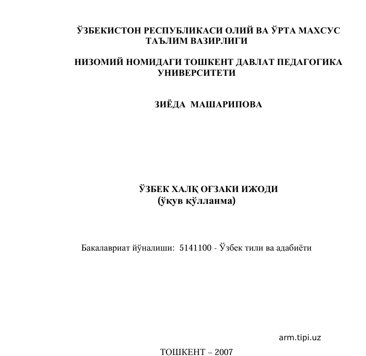 ЎЗБЕК ХАЛҚ ОҒЗАКИ ИЖОДИ Nomlanishi Yozilgan yili: 2007 - yil . Bo'limi: --- Elektron resurs QR code surati: Resurs haqida Ko'chirib olish masharipova-z_-ozbek_xalq_ogzaki_izhodi.pdf Hajmi: 943.67 Kb Ko'chirib olganlar: 25 Fayl nomi: masharipova-z_-ozbek_xalq_ogzaki_izhodi.pdf Faylni online o'qish: masharipova-z_-ozbek_xalq_ogzaki_izhodi.pdf O'xshash resurslar узбек тили амалий узбек рус тили SPORTDA MATEMATIK STATISTIK TAHLIL O'zbek Folklori SPORT OʻYINLARI VA UNI OʻQITISH METODIKASI