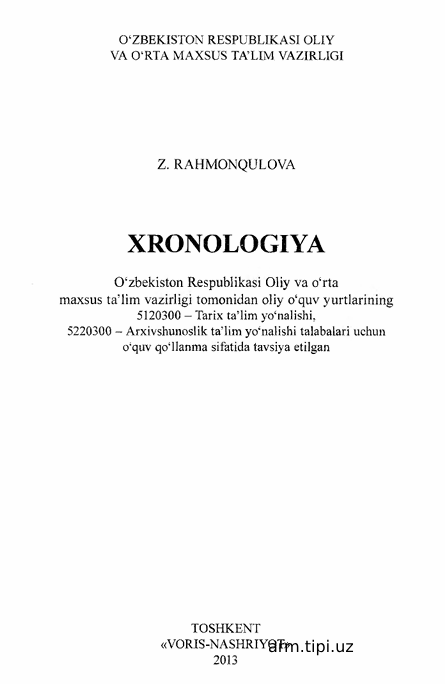 XRONOLOGIYA Nomlanishi Yozilgan yili: 2013 - yil . Bo'limi: Tarix (Bakalavr) uchun oʻquv adabiyotlari Elektron resurs QR code surati: Resurs haqida Ko'chirib olish xronologiya-z_rahmonqulova.pdf Hajmi: 5.28 Mb Ko'chirib olganlar: 6 Fayl nomi: xronologiya-z_rahmonqulova.pdf Faylni online o'qish: xronologiya-z_rahmonqulova.pdf O'xshash resurslar INNOVATSION IQTISОDIYOT SPORTDA MATEMATIK STATISTIK TAHLIL Behavioral Economics O'zbek Folklori SPORT OʻYINLARI VA UNI OʻQITISH METODIKASI
