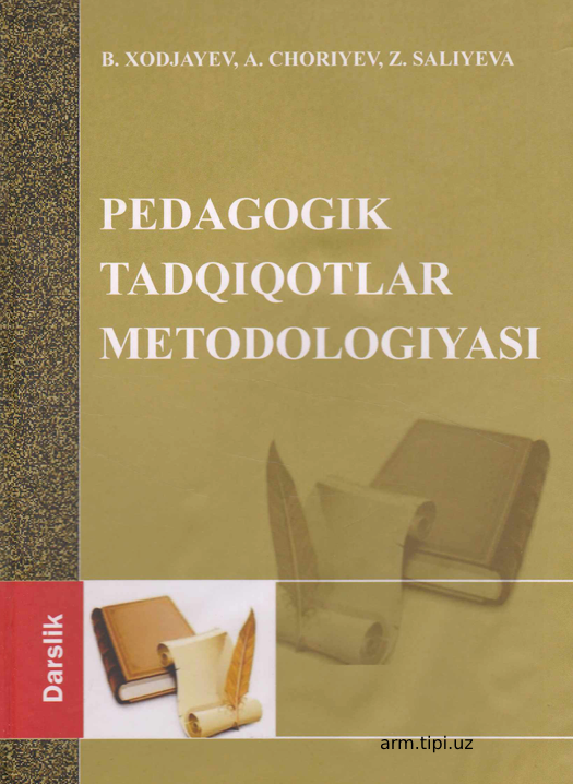 PEDAGOGIK TADQIQOTLAR METODOLOGIY ASI Nomlanishi Yozilgan yili: 2018 - yil . Bo'limi: Pedagogika (Bakalavr) uchun oʻquv adabiyotlari Elektron resurs QR code surati: Resurs haqida Ko'chirib olish 3_-xodjayev-b_-pedagogik-tadqiqotlar-metodologiyasi.pdf Hajmi: 5.76 Mb Ko'chirib olganlar: 5 Fayl nomi: 3_-xodjayev-b_-pedagogik-tadqiqotlar-metodologiyasi.pdf Faylni online o'qish: 3_-xodjayev-b_-pedagogik-tadqiqotlar-metodologiyasi.pdf O'xshash resurslar Yosh davrlari va pedagogik psixologiya PEDAGOGIK TEXNOLOGIYA VA PEDAGOGIK MAHORAT FANINING 0 ‘QUV MASHG‘ULOTLARINI LOYIHALASH PEDAGOGIK TEHNOLOGIYALAR VA PEDAGOGIK MAHORAT YOSH DAVR PEDAGOGIK PSEXOLOGIYA INGLIZ TILI OʻQITISHNING INNOVATSION PEDAGOGIK TEXNOLOGIYALARI