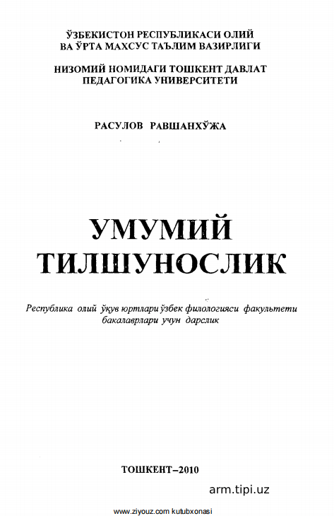 Umumiy tilshunoslik Nomlanishi Yozilgan yili: 2010 - yil . Bo'limi: Oʻzbek tili va adabiyoti (Bakalavr) uchun oʻquv ad Elektron resurs QR code surati: Resurs haqida Ko'chirib olish umumiy-tilshunoslik-ravshanxoja-rasulov.pdf Hajmi: 9.49 Mb Ko'chirib olganlar: 11 Fayl nomi: umumiy-tilshunoslik-ravshanxoja-rasulov.pdf Faylni online o'qish: umumiy-tilshunoslik-ravshanxoja-rasulov.pdf O'xshash resurslar Tilshunoslik nazariyasiga kirish Umumiy psixodiagnostika. Jalilova S.X, G'ayibova N.A ivanov, zufarova. umumiy psixologiya Rasulov Al, Toyirova L. Umumiy psixodiagnostika darslik (3) Rasulov Al, Toyirova L. Umumiy psixodiagnostika darslik.