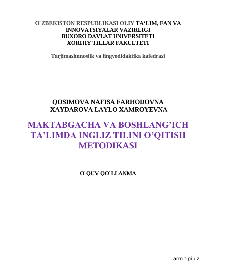 MAKTABGACHA VA BOSHLANG’ICH TA’LIMDA INGLIZ TILINI O’QITISH METODIKASI Nomlanishi Yozilgan yili: 2022 - yil . Bo'limi: Xorijiy til va adabiyoti (Bakalavr) uchun oʻquv ad Elektron resurs QR code surati: Resurs haqida Ko'chirib olish maktabgacha-talimda-ingliz-tili-oqitish-metodikasi-pdf-book.pdf Hajmi: 1.72 Mb Ko'chirib olganlar: 5 Fayl nomi: maktabgacha-talimda-ingliz-tili-oqitish-metodikasi-pdf-book.pdf Faylni online o'qish: maktabgacha-talimda-ingliz-tili-oqitish-metodikasi-pdf-book.pdf O'xshash resurslar Boshlang`ich sinflarda matematikao'qitish metodikasi 2005 Boshlang'ich sinflarda matematika o'qitish metodikasi labaratorya TARIX O'QITISH METODIKASI MAKTABGACHA TA‘LIMDA STEAM TEXNOLOGIYALARI MAKTABGACHA TA’LIM MUAS SASALARIDA MUSIQA 0‘QITISH METODIKASI