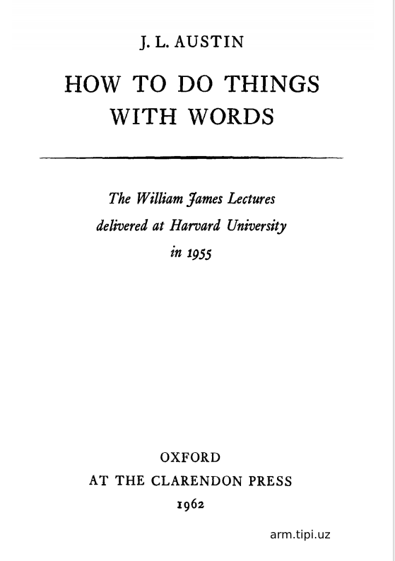 HOW TO DO THINGS WITH WORDS Nomlanishi Yozilgan yili: 1962 - yil . Bo'limi: Xorijiy til va adabiyoti (Bakalavr) uchun oʻquv ad Elektron resurs QR code surati: Resurs haqida Ko'chirib olish austin__how_to_do_things_with_words.pdf Hajmi: 5.3 Mb Ko'chirib olganlar: 2 Fayl nomi: austin__how_to_do_things_with_words.pdf Faylni online o'qish: austin__how_to_do_things_with_words.pdf O'xshash resurslar INNOVATSION IQTISОDIYOT NAVIGATE A1 SPORTDA MATEMATIK STATISTIK TAHLIL Behavioral Economics INTЕRСULTURАL СОMMUNIСАTIОN