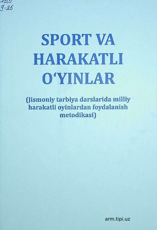 sport va harakatli o'yinlar Nomlanishi Yozilgan yili: 2018 - yil . Bo'limi: Sport faoliyati (Bakalavr) uchun oʻquv adabiyotlar Elektron resurs QR code surati: Resurs haqida Ko'chirib olish milliy-harakatli-oyinlar-kitob.pdf Hajmi: 53.14 Mb Ko'chirib olganlar: 3 Fayl nomi: milliy-harakatli-oyinlar-kitob.pdf Faylni online o'qish: milliy-harakatli-oyinlar-kitob.pdf O'xshash resurslar milliy va harakatli o'yinlar milliy harakatli o'yinlar SPORT OʻYINLARI VA UNI OʻQITISH METODIKASI OMMAVIY SPORT-SOG‘LOMLASHTIRISH TADBIRLARINI TASHKILLASHTIRISH gimnastika sport turida sportchilarni tayyorlanishining ilmiy - uslubiy asoslari