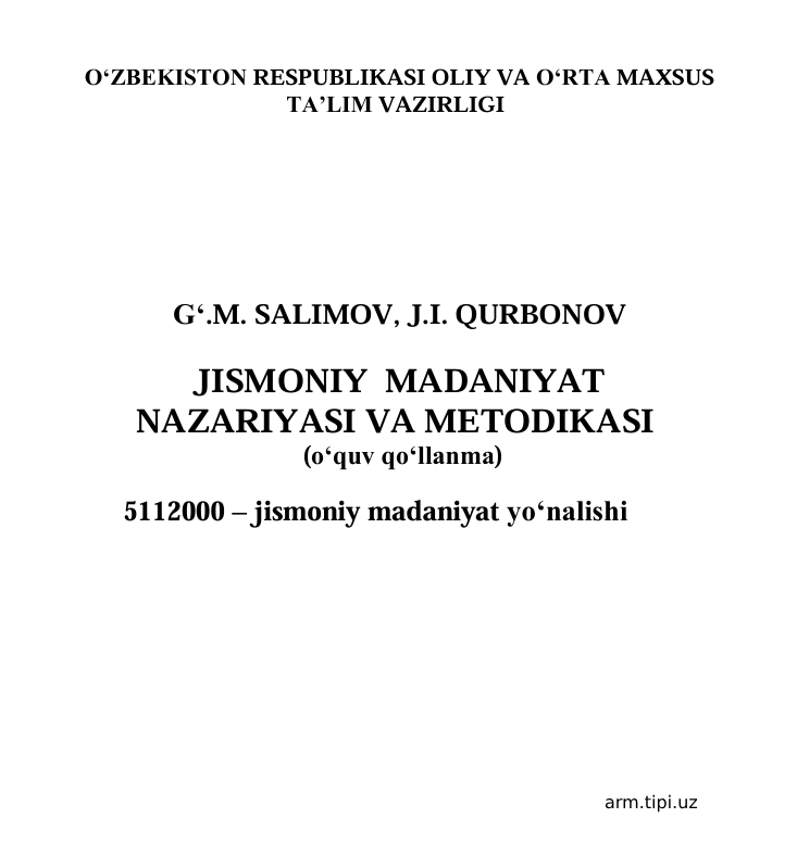 JISMONIY MADANIYAT NAZARIYASI VA METODIKASI Nomlanishi Yozilgan yili: 2019 - yil . Bo'limi: --- Elektron resurs QR code surati: Resurs haqida Ko'chirib olish g_m_-salimov-j_i_-qurbonov.pdf Hajmi: 3.4 Mb Ko'chirib olganlar: 5 Fayl nomi: g_m_-salimov-j_i_-qurbonov.pdf Faylni online o'qish: g_m_-salimov-j_i_-qurbonov.pdf O'xshash resurslar A.Jo’rayev, M.Usmonova Jismoniy shaxslarni soliqqa tortish, O’quv qo’llanma.2015. 216-bet JISMONIY MADANIYAT NAZARIYASI VA METODIKASI JISMONIY MADANIYAT NAZARIYASI VA METODIKASI Boshlang`ich sinflarda matematikao'qitish metodikasi 2005 TARIX O'QITISH METODIKASI