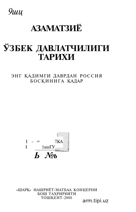 ЎЗБЕК ДАВЛАТЧИЛИГИ ТАРИХИ Nomlanishi Yozilgan yili: 2000 - yil . Bo'limi: Tarix (Bakalavr) uchun oʻquv adabiyotlari Elektron resurs QR code surati: Resurs haqida Ko'chirib olish azamat-ziyo_-ozbek-davlatchiligi-tarixi_-kitob_-t_-2000-2.pdf Hajmi: 1.65 Mb Ko'chirib olganlar: 7 Fayl nomi: azamat-ziyo_-ozbek-davlatchiligi-tarixi_-kitob_-t_-2000-2.pdf Faylni online o'qish: azamat-ziyo_-ozbek-davlatchiligi-tarixi_-kitob_-t_-2000-2.pdf O'xshash resurslar ЖАҲОН ЦИВИЛИЗАЦИЯЛАРИ ТАРИХИ Инглиз тили тарихи фанидан Кадимги Урта Осиё шаxарлари тарихи узбек тили амалий узбек рус тили